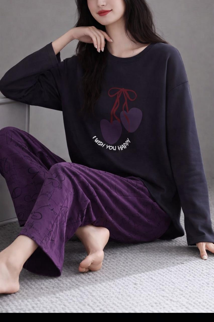 0000 Black Double Heart Printed Full Sleeves T-shirt With Purple Printed Pajama Suit