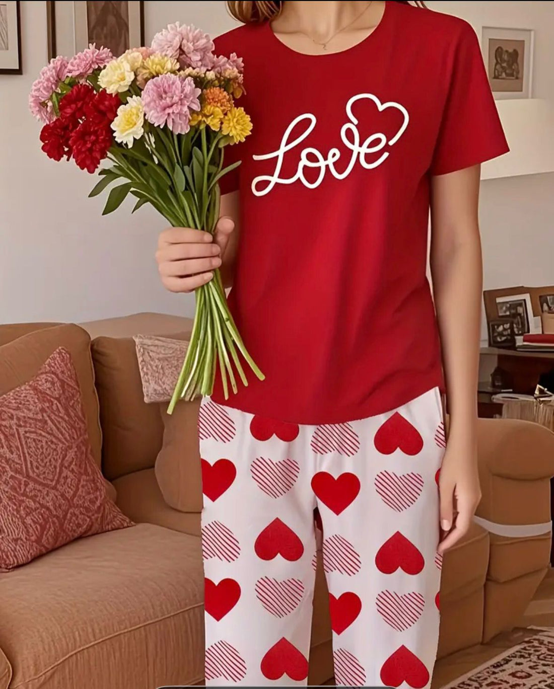 0000 Red Love Printed Half Sleeves T-shirt With Heart Printed Pajama Suit