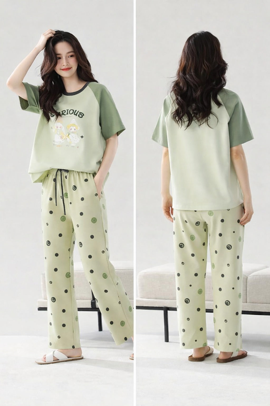 0000 Green Glorious Printed Half Sleeves T-shirt With Dots Printed Pajama Suit