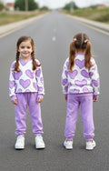 0000 Offwhite Lilac Heart Printed Sweatshirt With Lilac Fleece Trouser Tracksuit For Kids