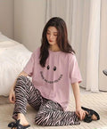 0000 Pink Smiley Printed Half Sleeves T-shirt With cheetah Printed Pajama Suit