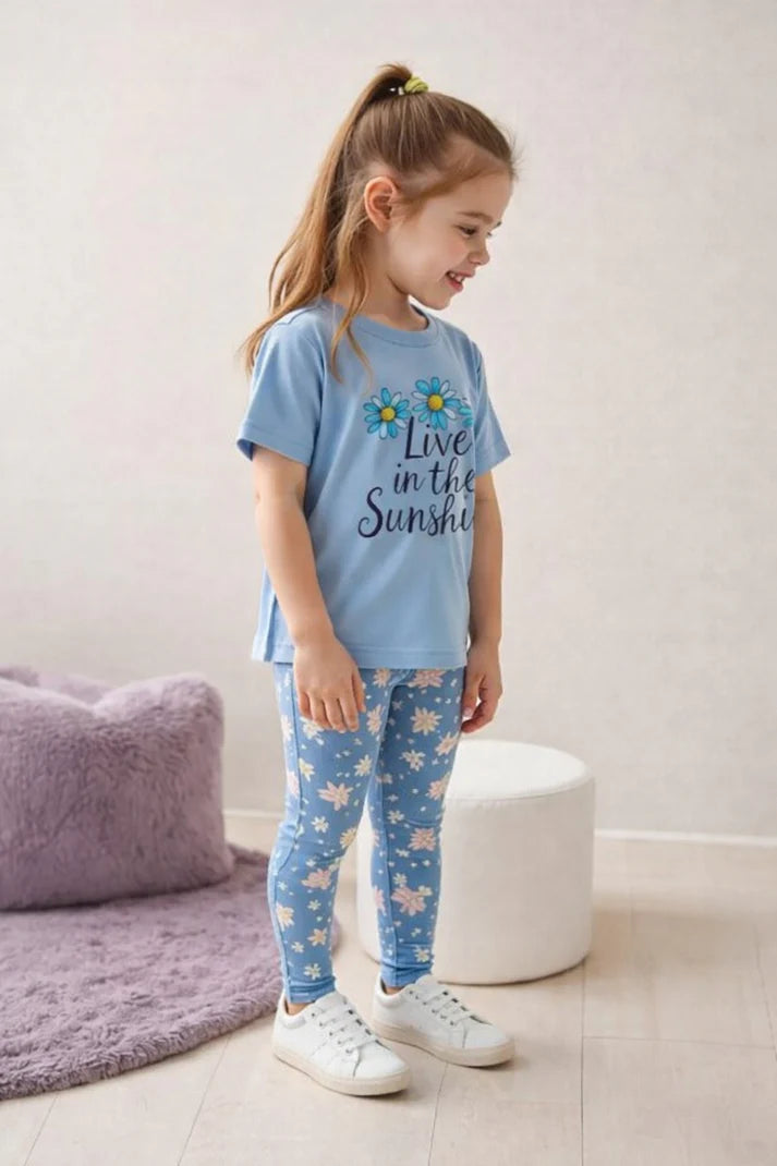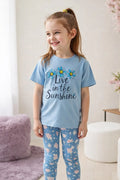 0000 Sky Blue Love In the Sunshine Printed Half Sleeves T-shirt with Flower Printed Pajama Kids Suits